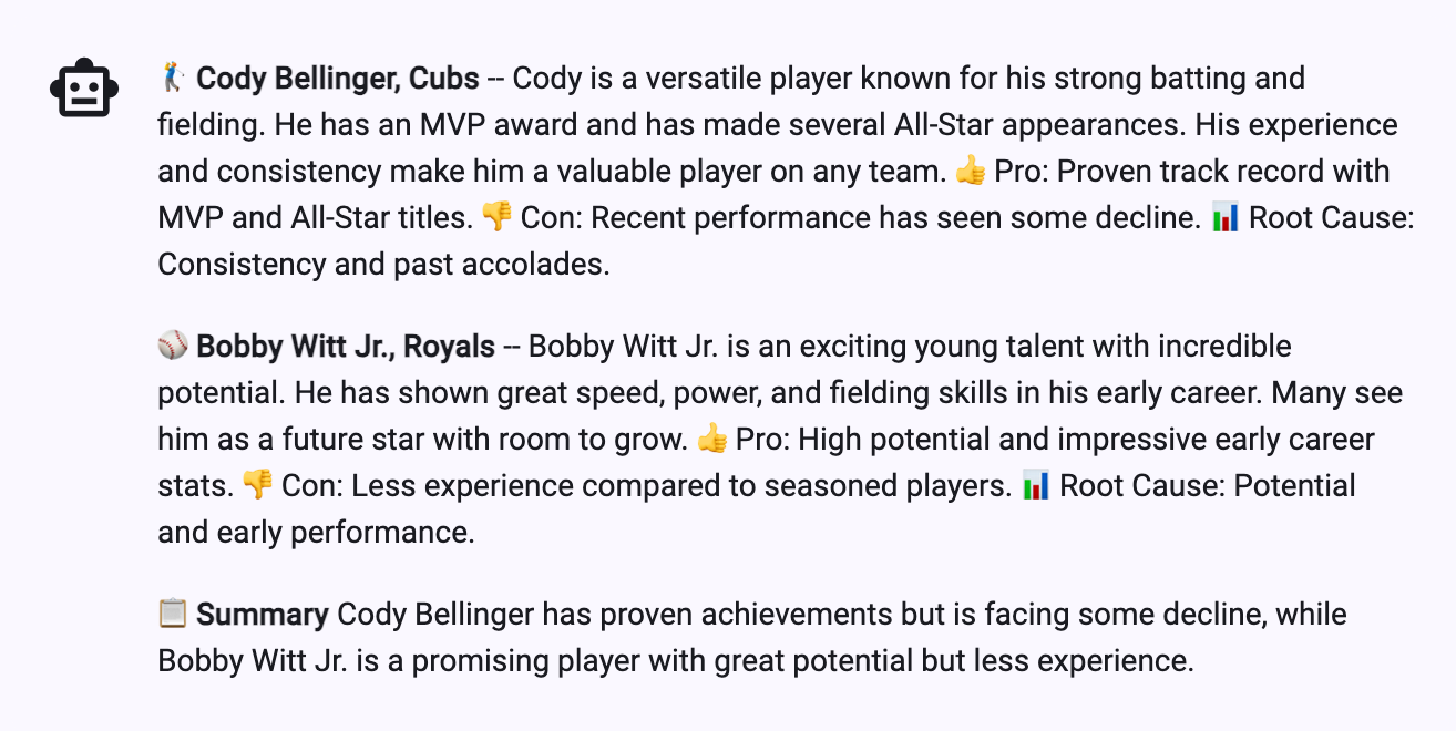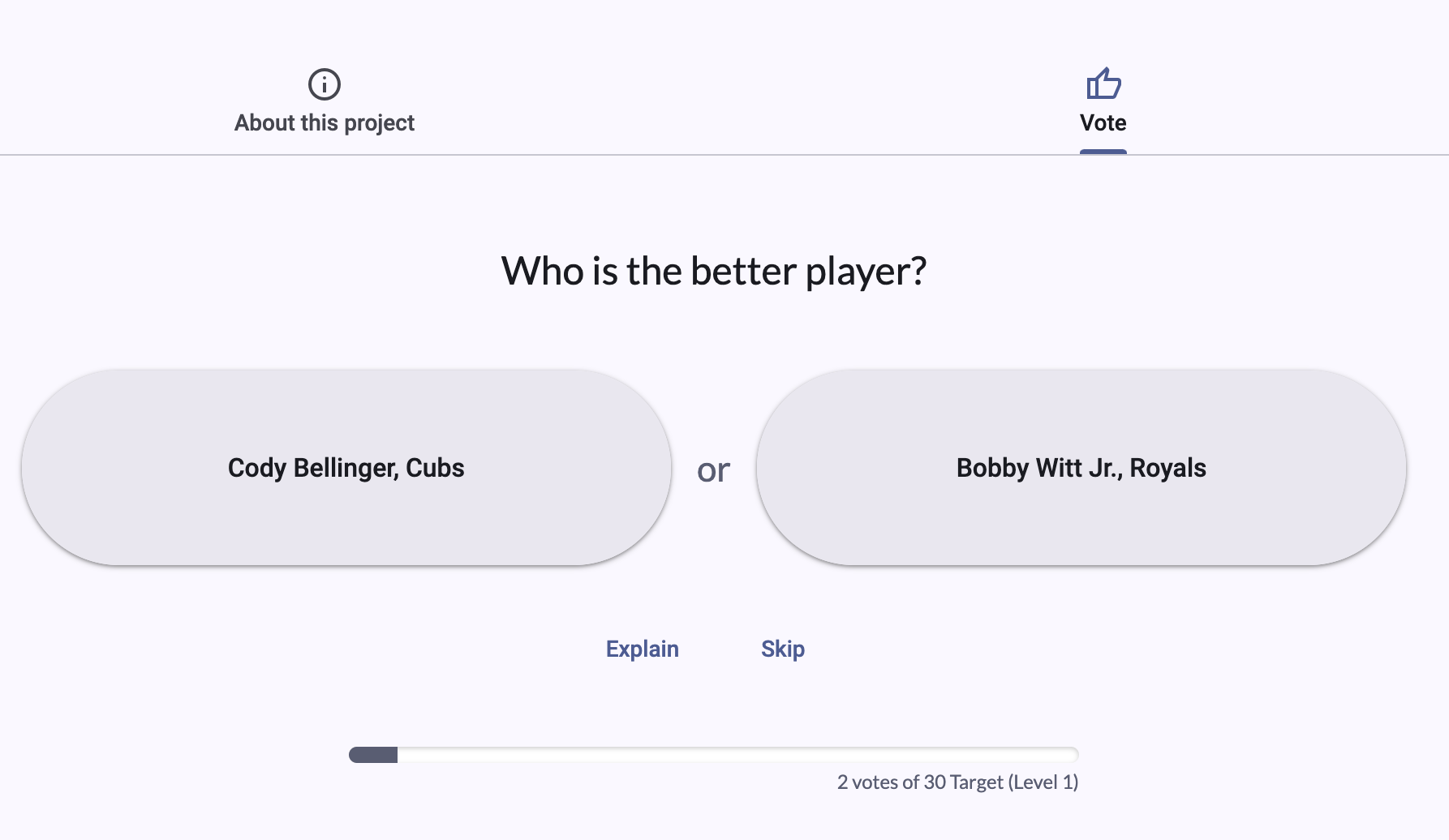 A quick explanation: There are three basic options. You could vote for one of the two players—in this case, you could vote for Bellinger or Witt, and I’m not giving any hints or trying to sway you in any way. You could hit the “Explain” button, which would give you an AI rundown of your options; I’m not sure you’ll want to slow yourself up, but if you’re interested, that would look like this: