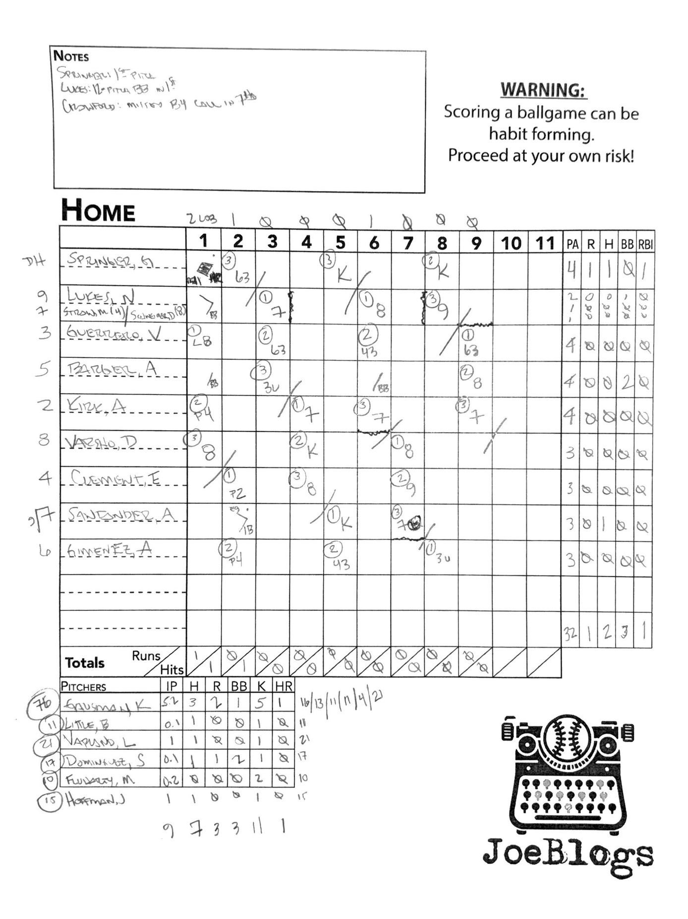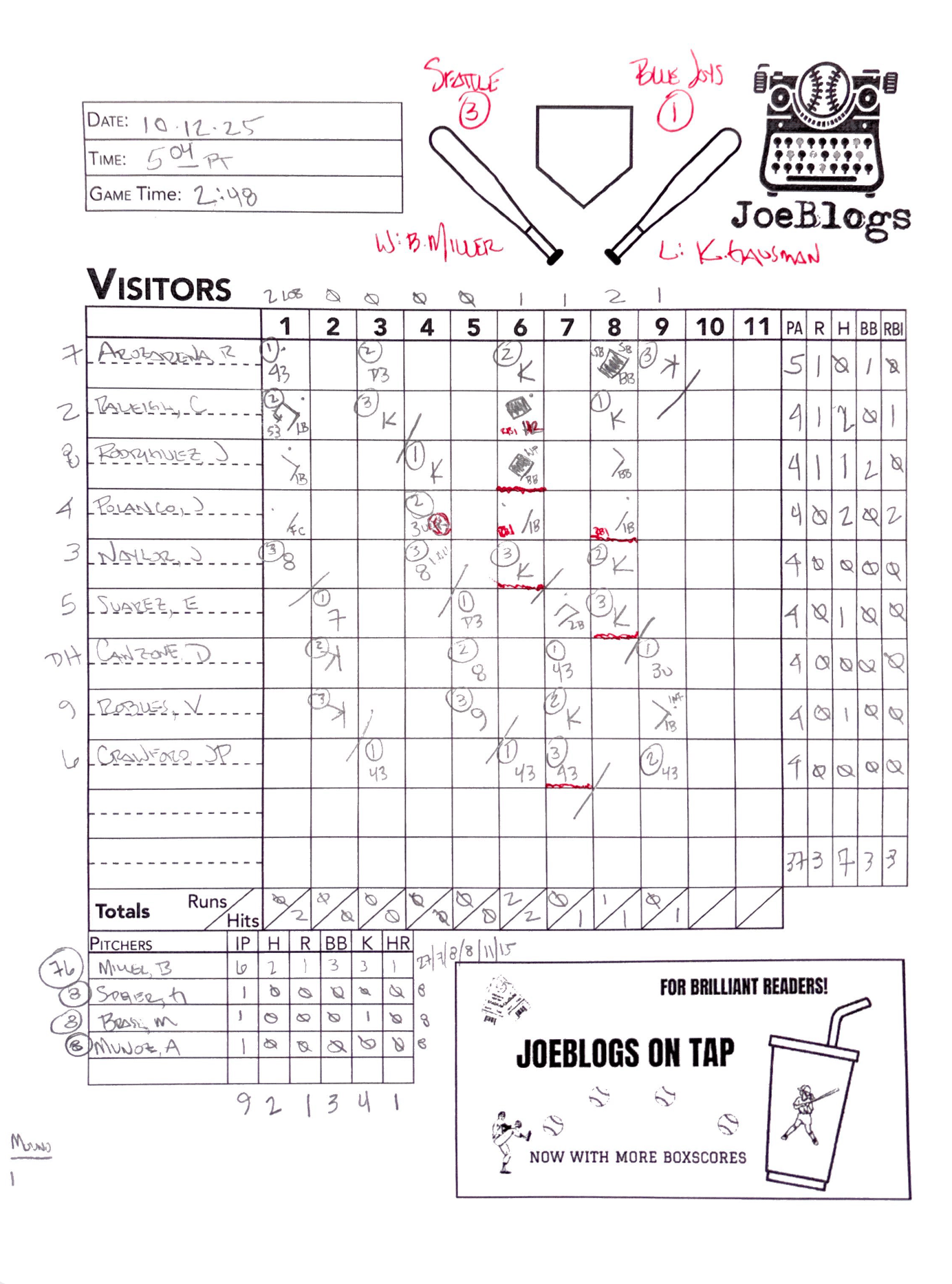 Our scorecard of the day comes from Brilliant Reader Dan, who scored last night’s Mariners victory in Game 1 of the ALCS. He asks everyone to please excuse the mess, which, of course, we will. A clean scorecard is like a 300 game in bowling. We may strive for it, but it’s probably not going to happen.