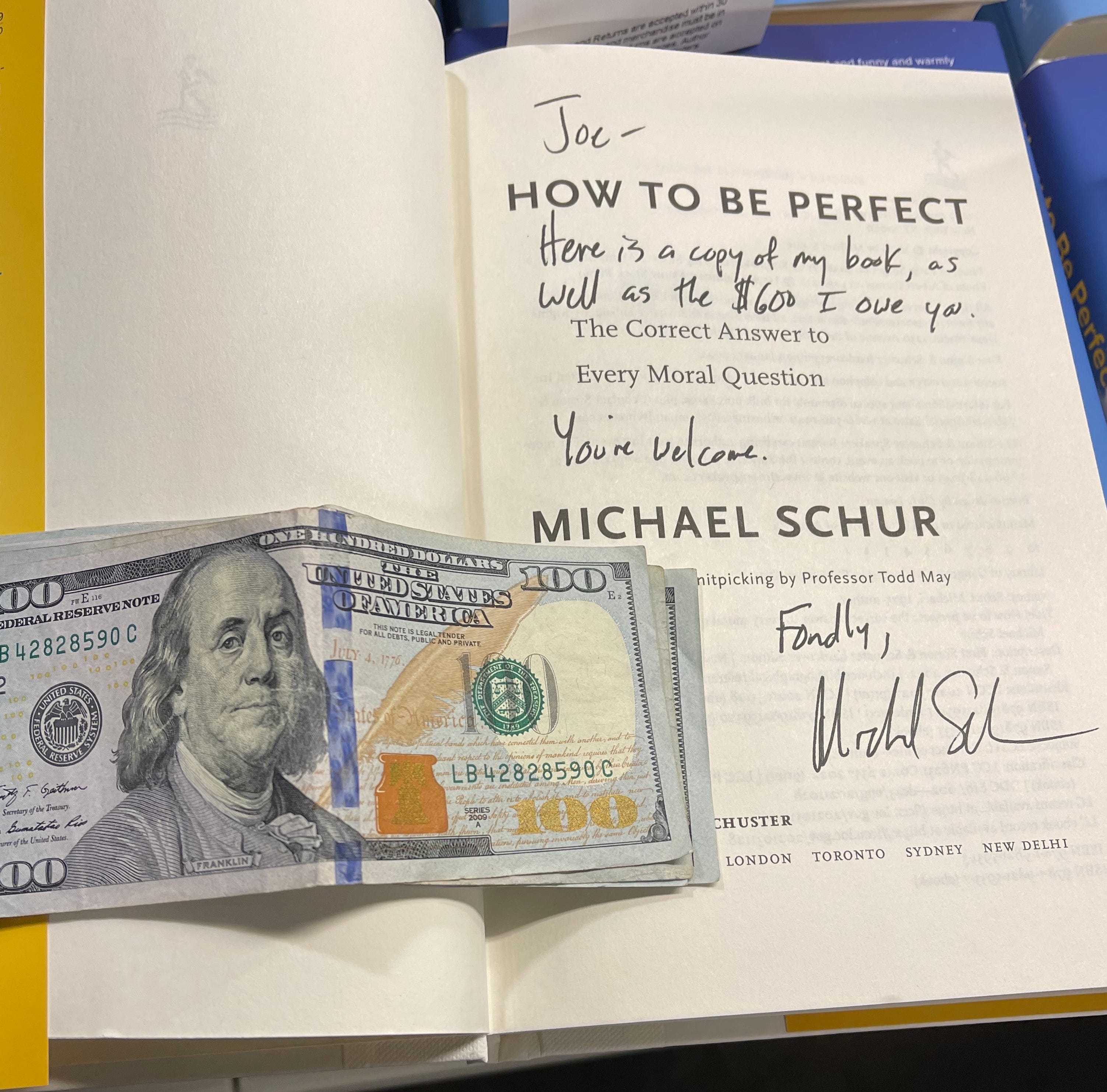 I’m sitting here in Kansas City watching Michael Schur sign lots of copies of his new book How To Be Perfect (and getting ready to sign a few more of my own). Undoubtedly, the most important book that Mike has signed so far was this one: