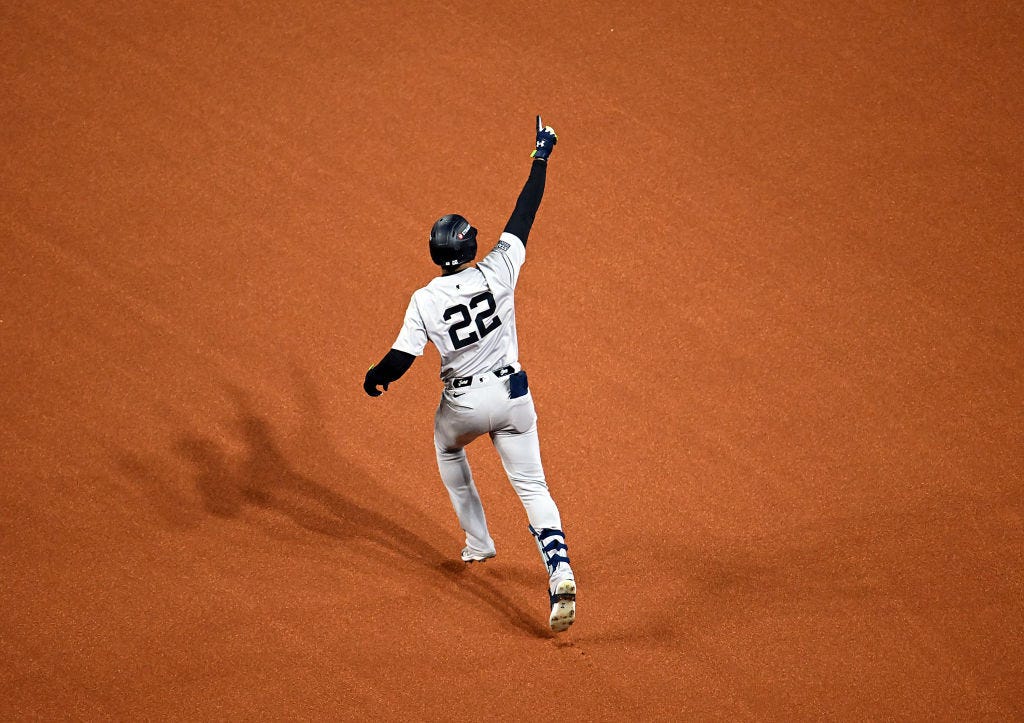 The Yankees lead this best-of-seven series 3-1. They just need one more victory to return to the World Series for the first time in 15 years. One more win. And this game is winnable right here, right now. The score is 2-2 in the 10th inning. The Yankees have two runners on base. Juan Soto is one of the best hitters on planet Earth.