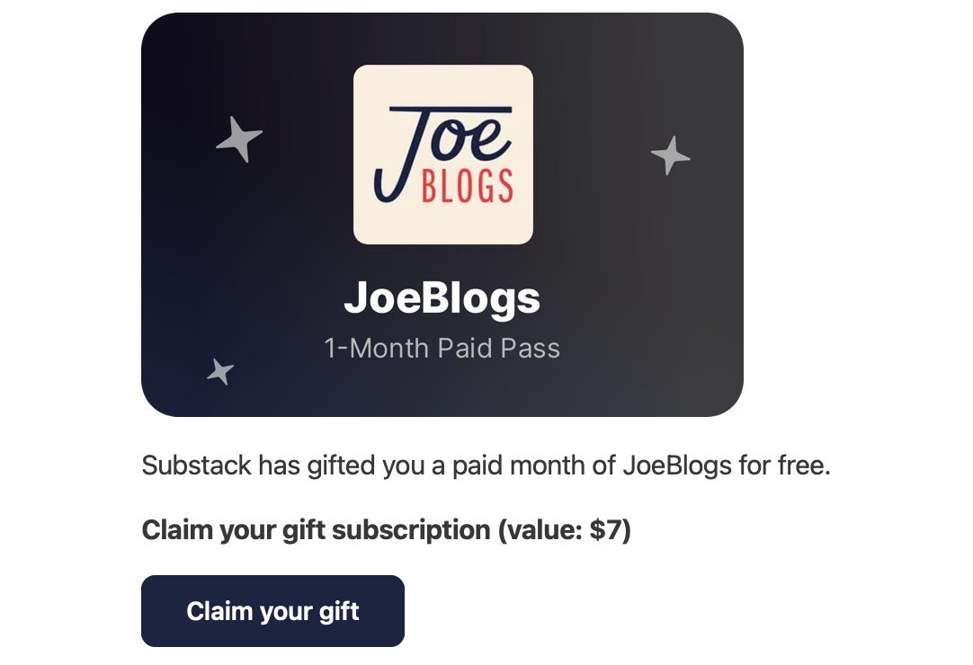This is a real thing. Apparently, Substack is giving out a month-long, free subscription to JoeBlogs to free readers… I think the deal is that they’re trying to get more people to download the app. It’s obviously and totally your call whether you want to download the app and get a free month’s worth of my ramblings, but I did want to let you know that this isn’t spam, it’s an actual thing.