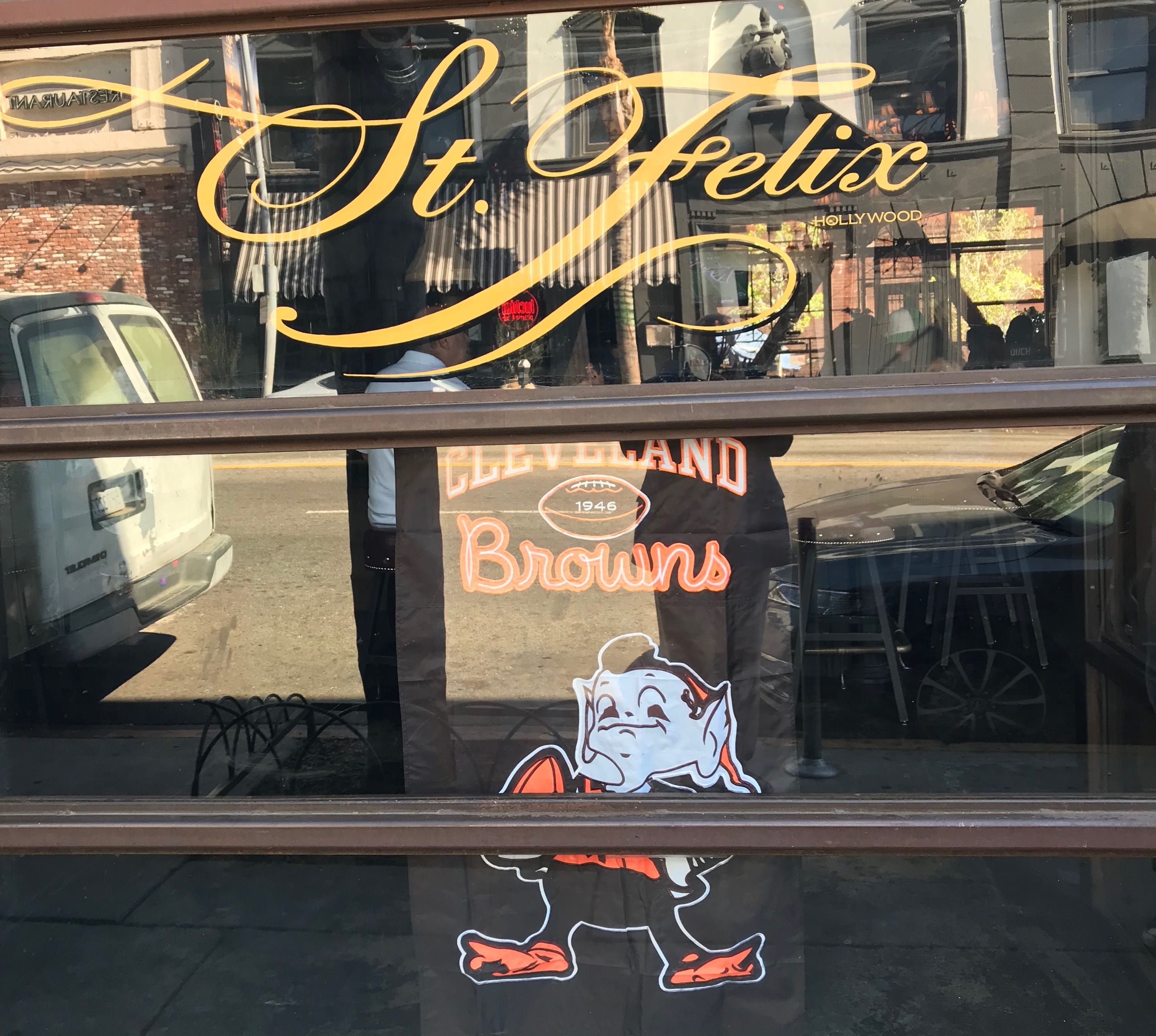 Saint Felix is normally just a regular bar. There are a bunch of photos of Hollywood women on the wall. The place is decorated for Halloween, complete with fake spider webs and such. But every Sunday of the fall, for just a few hours, the Saint Felix becomes a Cleveland Browns bar.