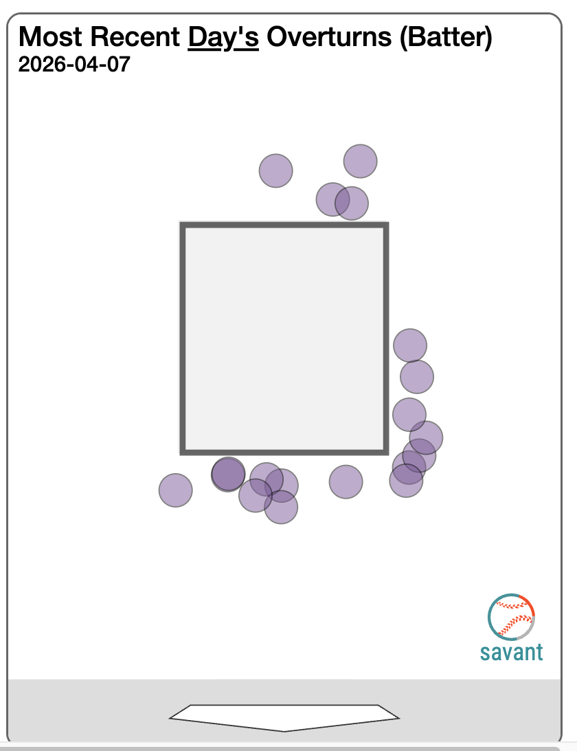 I show you both to point out just how close these pitches are. There are a few stray pitches in the overturned box — particularly the cluster of low pitches — that are relatively clear, but look at that confirmed box. I mean, every one of those pitches is right on the edge. I would say there was not a single bad challenge all day.