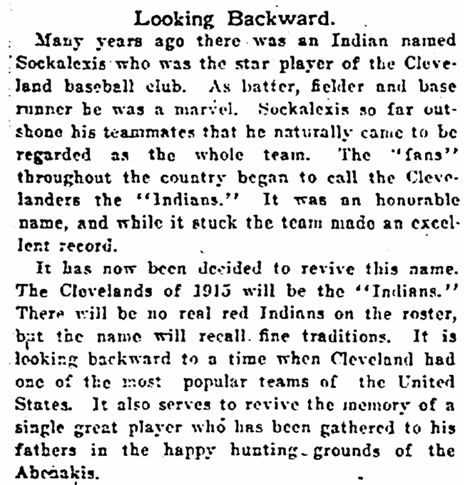 But you should know it is the only time the Plain Dealer or any other paper connected the team name to Sockalexis (they Plain Dealer would not write his name for another 10 years). In fact, there were a handful of other stories written about Sockalexis in 1915 and in the decade afterward, and not one of them even suggested that Cleveland had named its team in his honor.