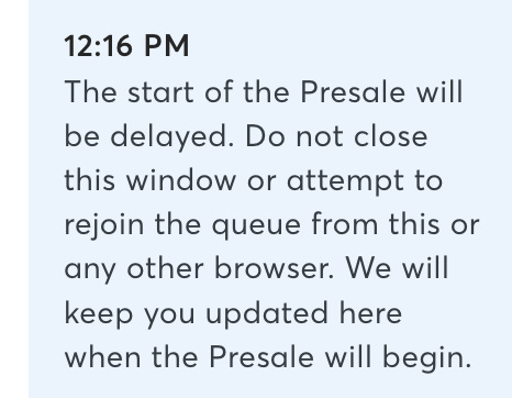 Um, well, OK then. That doesn’t sound too bad, right? Temporarily paused sounds like, you know, 15 minutes right? Something like that. So, I waited there. I could do a little work, sort of. I could watch a few Ryan George videos, I decided. And OK, so 15 minutes became a half hour, right, and a half hour became an hour, and at 12:16, I got this cheerful message from Ticketmaster.
