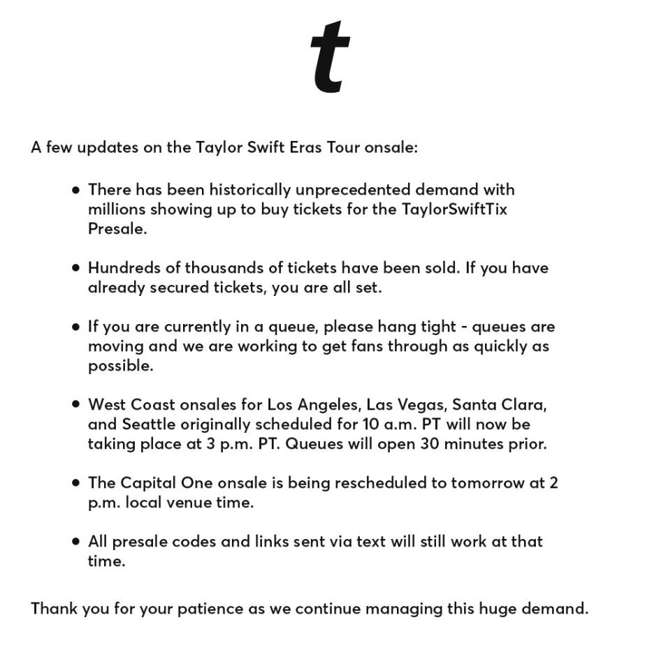 Meanwhile, Ticketmaster — which charges, I think this is right, a $3,930 surcharge on every ticket — seemed entirely helpless, even though they had to know EXACTLY HOW MANY PEOPLE would be coming since they are the ones that decided who gets to be a verified fan. They posted this not-at-all-comforting update.