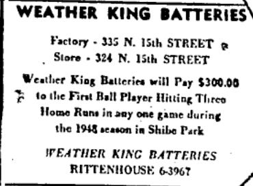 One more little story: Weather King batteries had an ad in the Philadelphia program offering $300 to any ballplayer -- home or visitor -- who hit three home runs in a game.