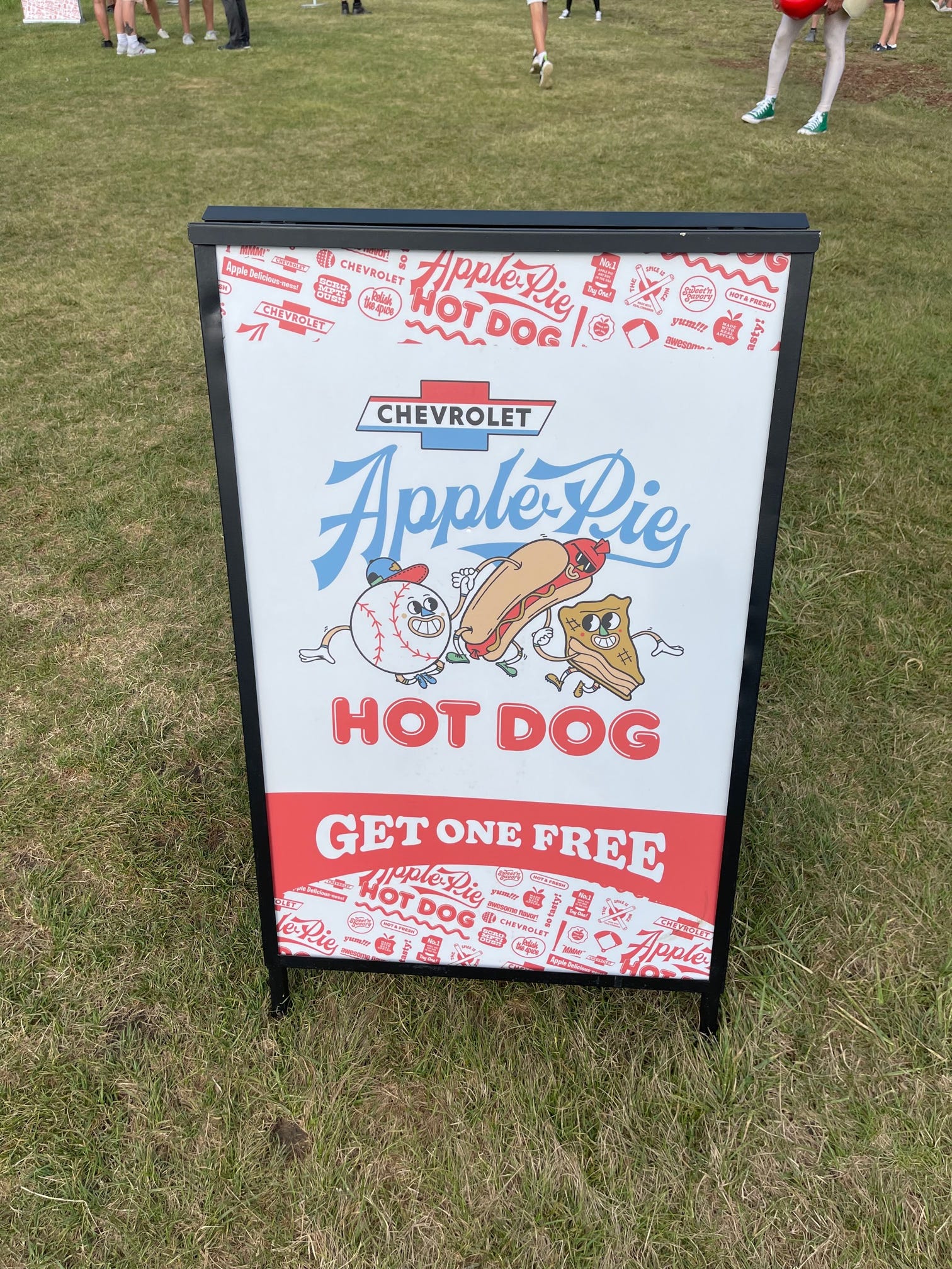 This was a real thing — an Apple Pie Hot Dog, sponsored by Chevrolet. You might have heard the “Baseball, Hot Dogs, Apple Pie and Chevrolet” song (and then you might not have heard it since it is like 50 years old), so Chevy had someone dressed in a hot dog costume, someone dressed up as an apple pie, someone wearing the Chevrolet logo, and they gave out these apple pie hot dogs, which are just what they sound like. They are apple pies with hot dogs inside.