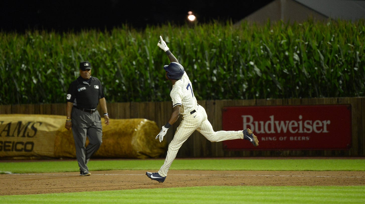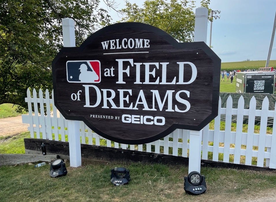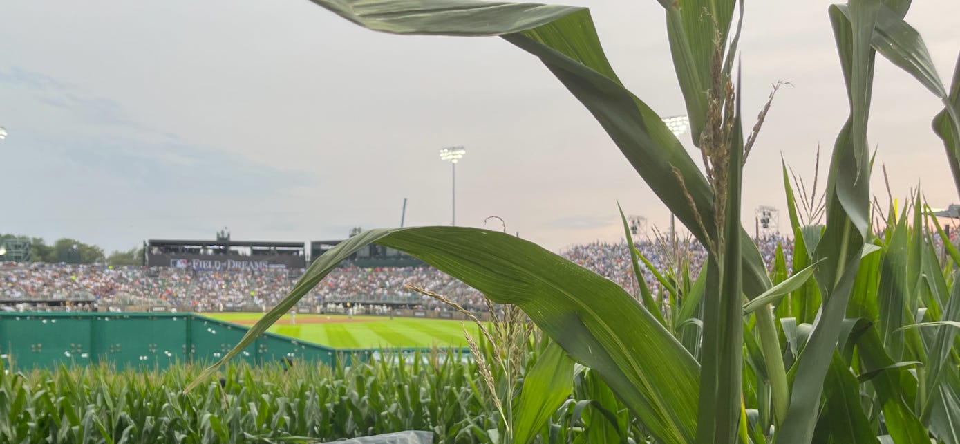 A friend wrote this to me about the Field of Dreams game: “I thought the whole thing was really dumb — a fictionalized version of a fictionalized location, and everyone getting all weepy and nostalgic about it as if it all had been true. But then I was watching a major league game in a cornfield, and it was really awesome.”