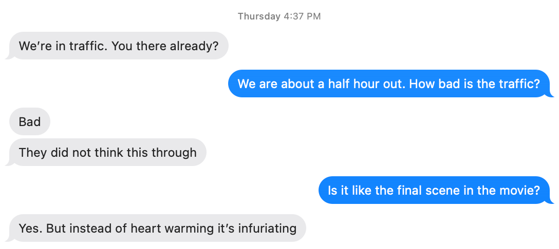 Well, this turned out to be true to life. There were hundreds and hundreds of cars lined up trying to get into Dyersville for Thursday’s game. I’m told people were stuck in that line for ninety minutes, even two hours. As we left Cedar Rapids and headed for the game, I was having text exchanges like this from my pal Michael Schur.