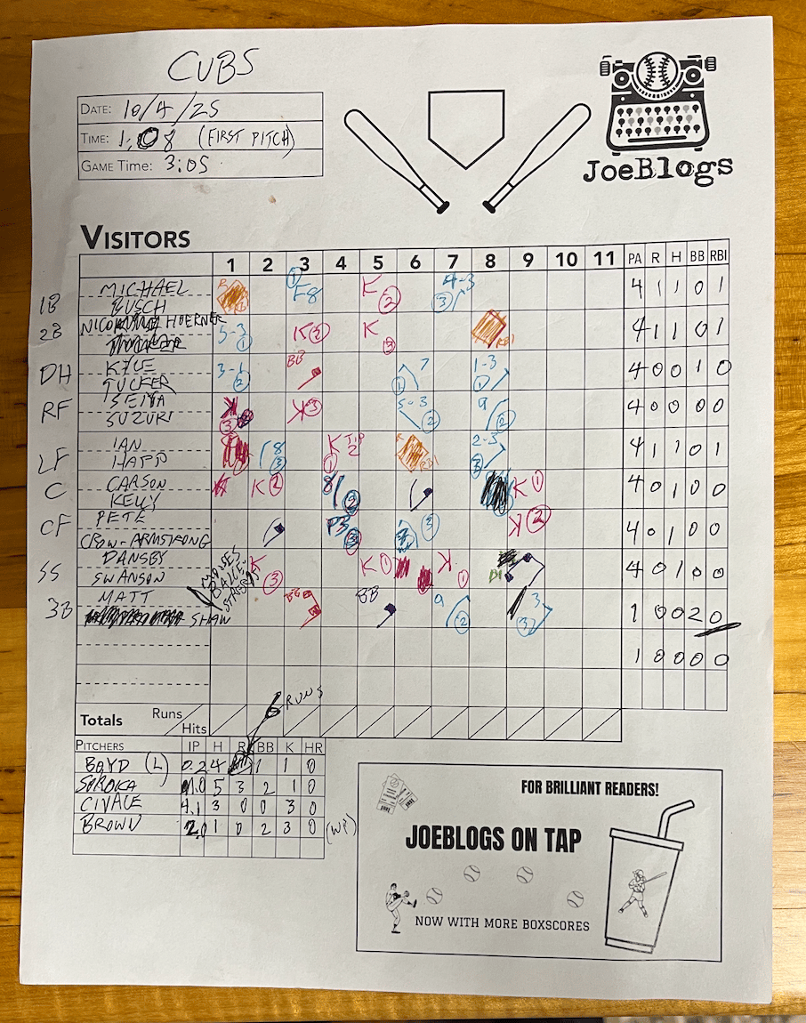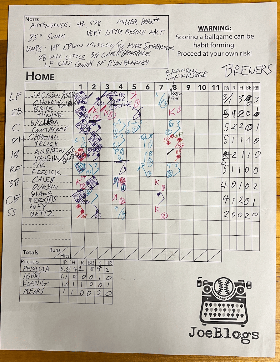 Brilliant Reader Nato sends in his color-coded scorecard from Game 1 of the Brewers-Cubs’ series.