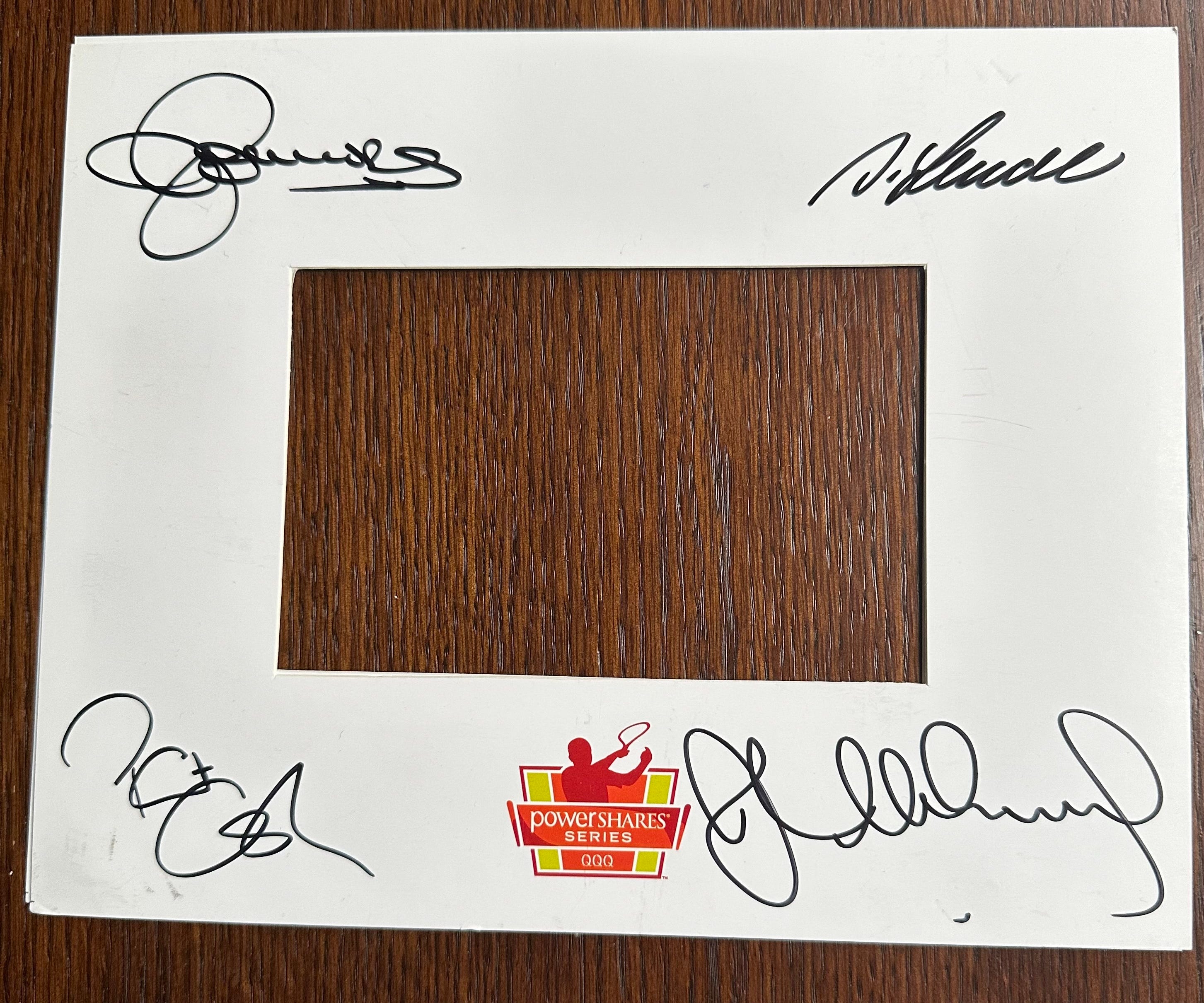 So, that is a cardboard picture frame. And it is signed by—Jimmy Connors, Ivan Lendl, Pat Cash and John McEnroe. I assume it was supposed to go around some photo I took with them when I got the chance to play with them in 2014. I don’t remember ever taking such a photo (I don’t do that sort of thing much). And I don’t remember getting this either (I don’t collect autographs, really).