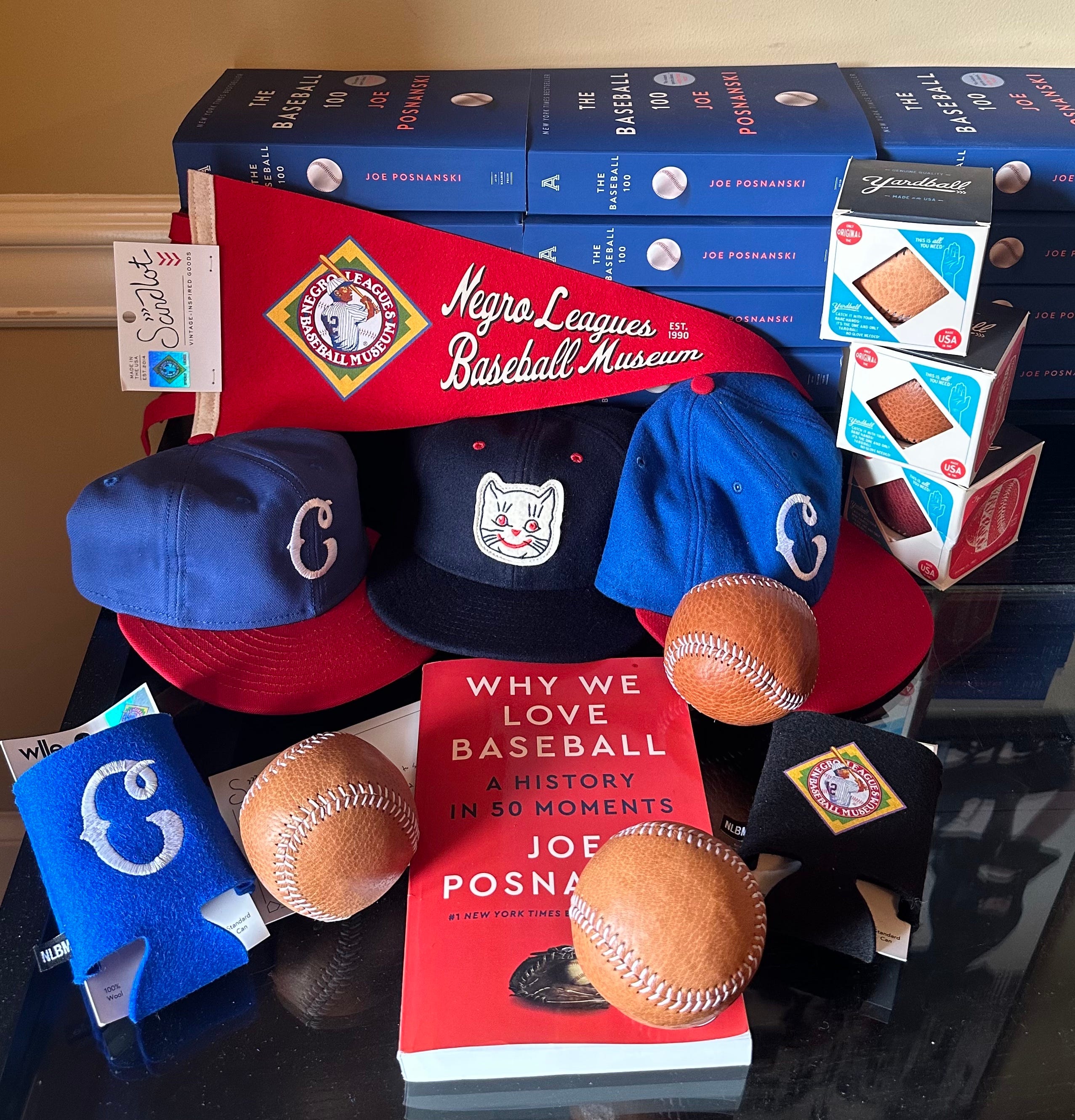 Awesome, right? We’ve got what they call “Yardballs” — these awesome leather baseballs that you can throw around. You will see a couple of Cleveland Buckeyes hats, a Negro Leagues Museum pennant and can holder, I mean this is awesome stuff. And yes, I know, you’re asking: What is that cat hat? I will tell you exactly what that cat hat is — I have absolutely no idea.