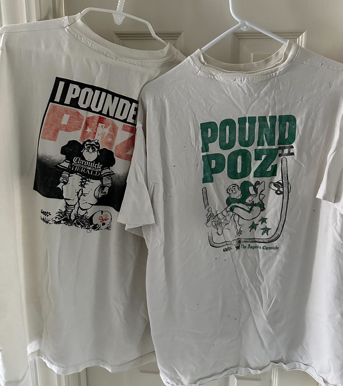 In retrospect, I built up a bit of a name in and around town. It didn’t feel that way back then, but my picture was in the paper just about every day, and I was also the focus of one of the most absurd promotions in newspaper history, the infamous “I Pounded Poz” football prognostication game. In this game, I would select 20 college and pro games and then make my picks. People would send in their picks and if they got more right than I did, they won an “I Pounded Poz” T-shirt, complete with a cartoon drawing (done by my friend, decorated editorial cartoonist Rick McKee) of me getting booted through the goal-post uprights.