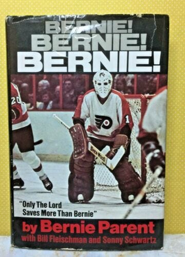 It didn’t matter the sport, either. I vividly remember the day that Bernie Parent’s book Bernie! just appeared on the shelf. I had never heard of him, didn’t know he was a goaltender, didn’t know a single thing about hockey. But I pulled the book from the shelf and looked at the weird cover — it was a photo of Parent in full goalie gear, including the mask, with the words “BERNIE!” above his head three times — and then saw the amazing quote at the bottom: