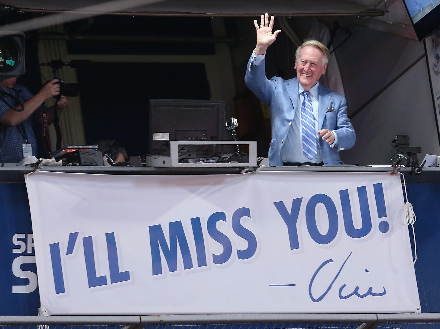 Vin Scully! He has been a Los Angeles icon now for more than 50 years. There are not many of the great baseball voices left, not from the old days. Ernie Harwell up in Detroit — Vin’s buddy for almost 60 years — died in May. Philadelphia’s Harry Kalas died a year ago April. Jack Buck’s gone, Mel Allen’s gone, Bob Murphy, Joe Nuxhall, Herb Carneal, Jack Brickhouse, Herb Score, all gone.