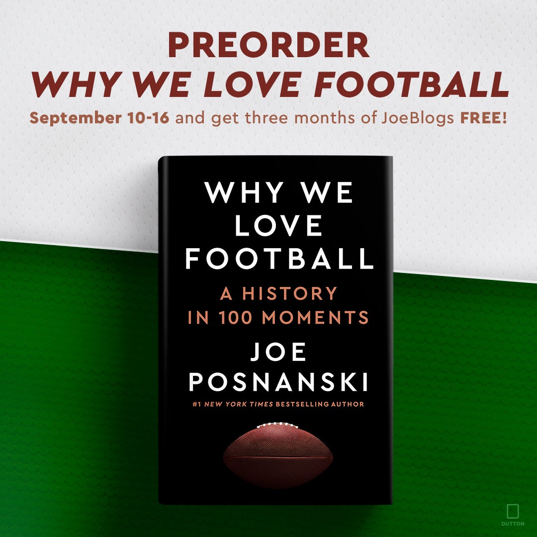 If you preorder WHY WE LOVE FOOTBALL between now and Sept. 16—as I mentioned, six days left—I’ll give you three months of JoeBlogs for free! Kind of a fun deal, I think. All you have to do is preorder the book from anywhere and then fill out this form and, voila, you’ll get the last three months of the year free, which will include a bunch of postseason baseball, lots of Hall of Fame stuff, Browns Diaries and whatever else comes into my head.