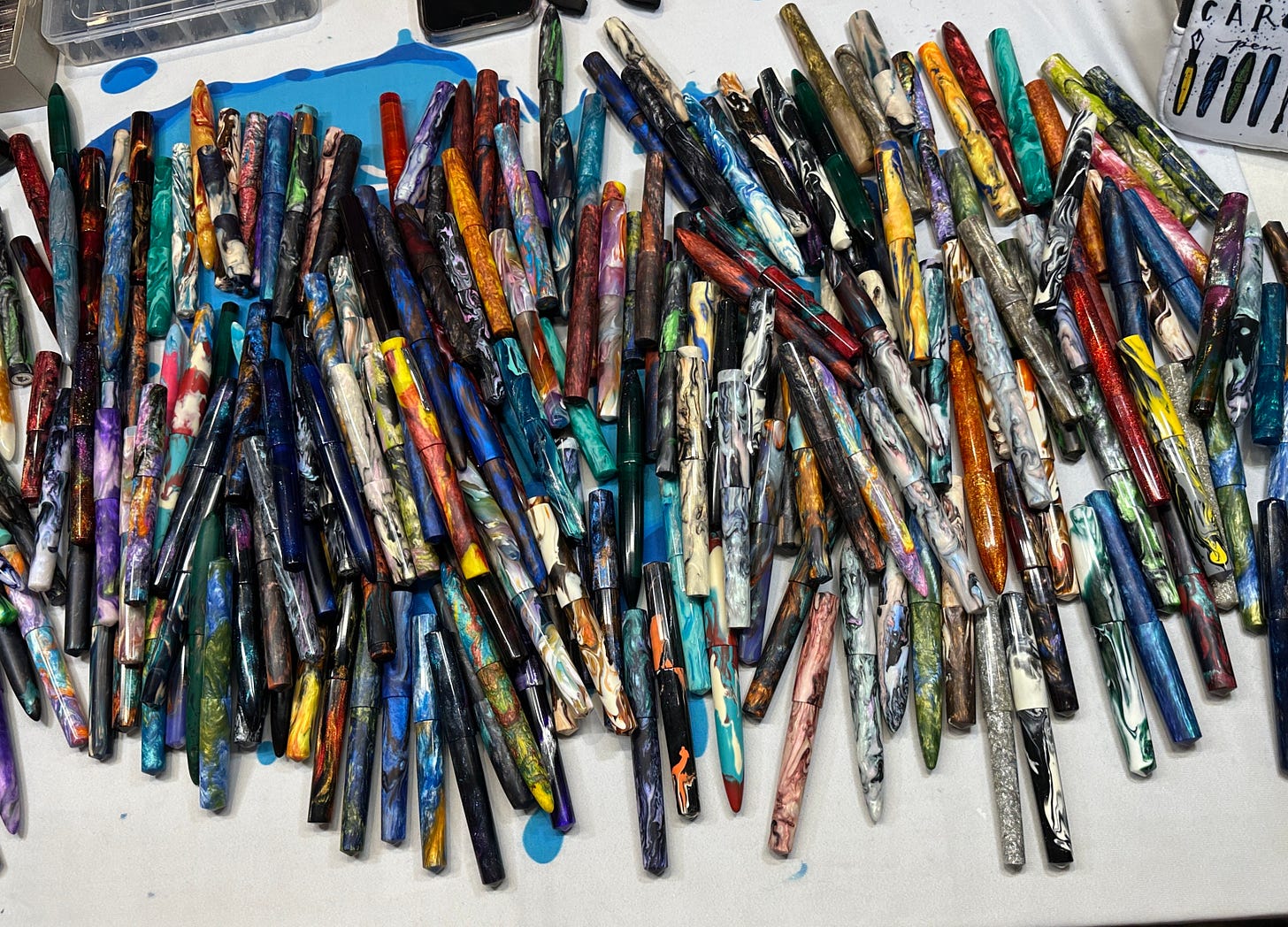 OK this is incredibly cool: There is a pen maker in Aiken, S.C., named Jonathan Brooks, who is, best I can tell, kind of the Elvis of fountain pens. And here is what he does: he puts out a whole mess of pens on his table and lets you pick the one that speaks to you:
