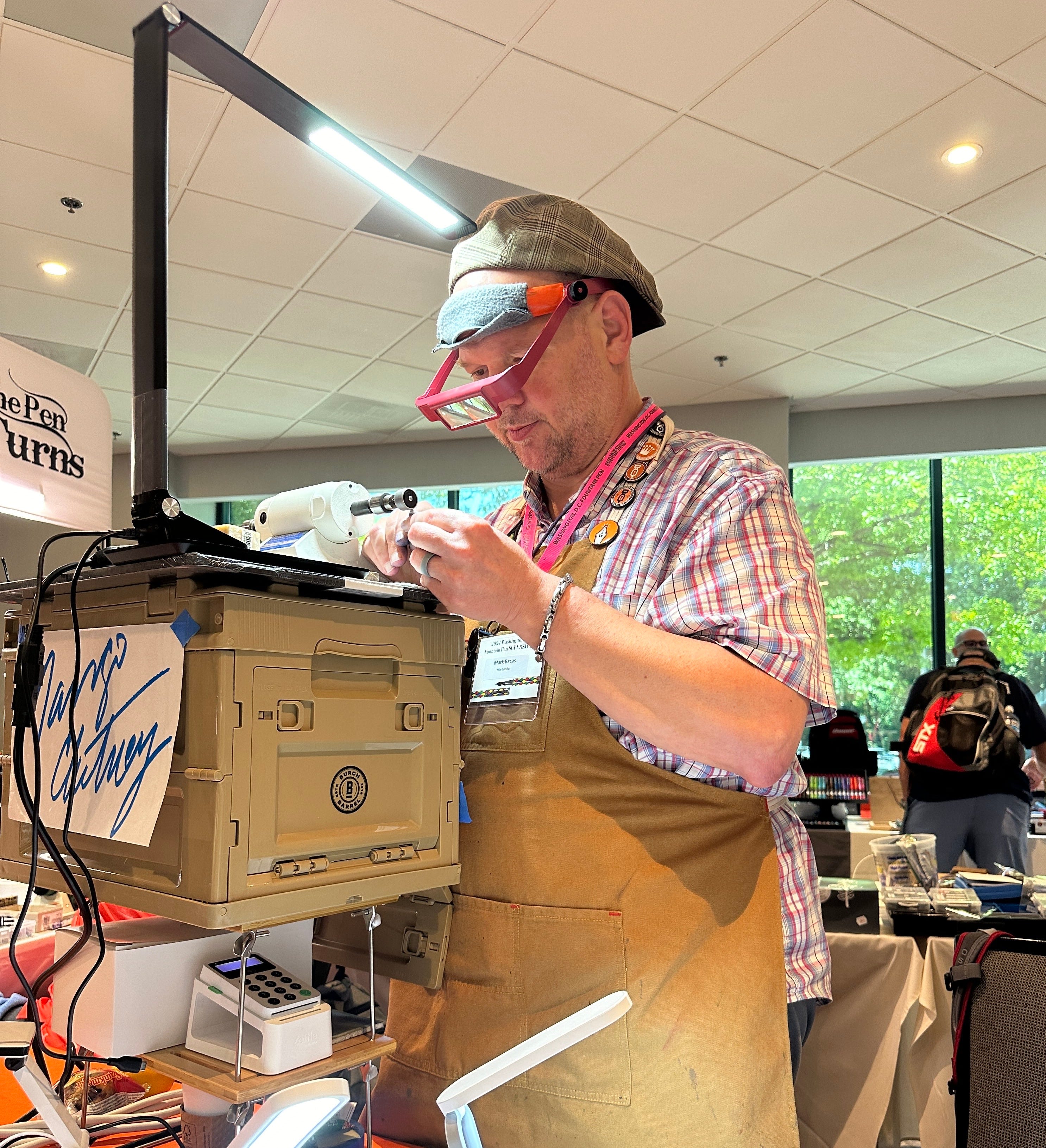 Here is Mark Bacas. He is a nibmeister and, I am told, another superstar in this world. He is grinding a nib for me that he calls a “specialty architect.” If you write with it on one side, it gives you a specialty writing experience where the down stroke is thin but the side stroke is thick. This is the architect grind. What makes this special is Mark smoothes it down so that if you turn the pen upside down, it gives you a fine point. It’s super cool.