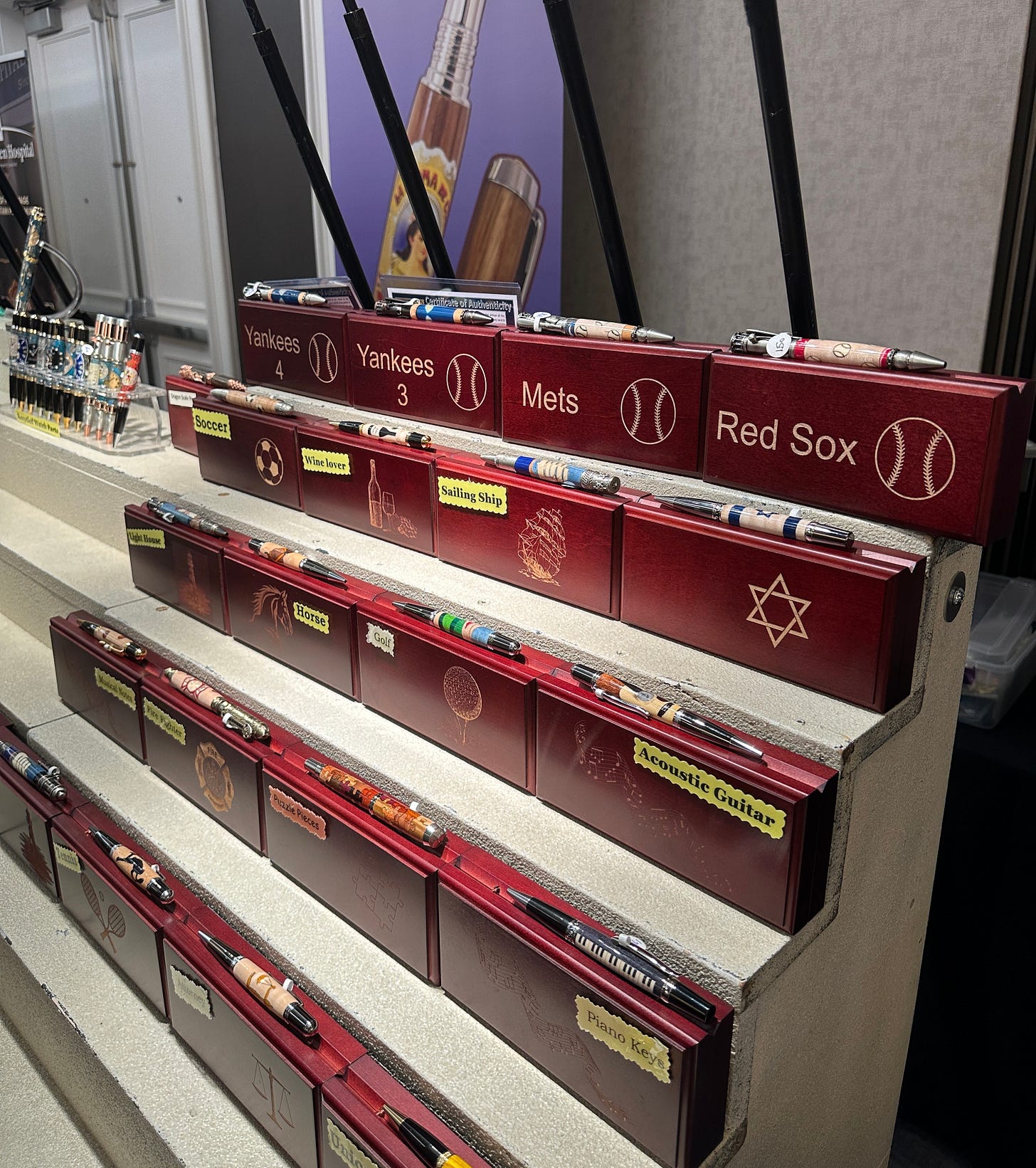 This is from Barry Gross. He makes super specialty, one-of-a-kind pens: The Yankees pen—it’s a ballpoint pen, not a fountain pen—for example, has a tiny sliver of Babe Ruth’s bat in it. The Mets pen has some of the wood from a seat at old Shea Stadium.