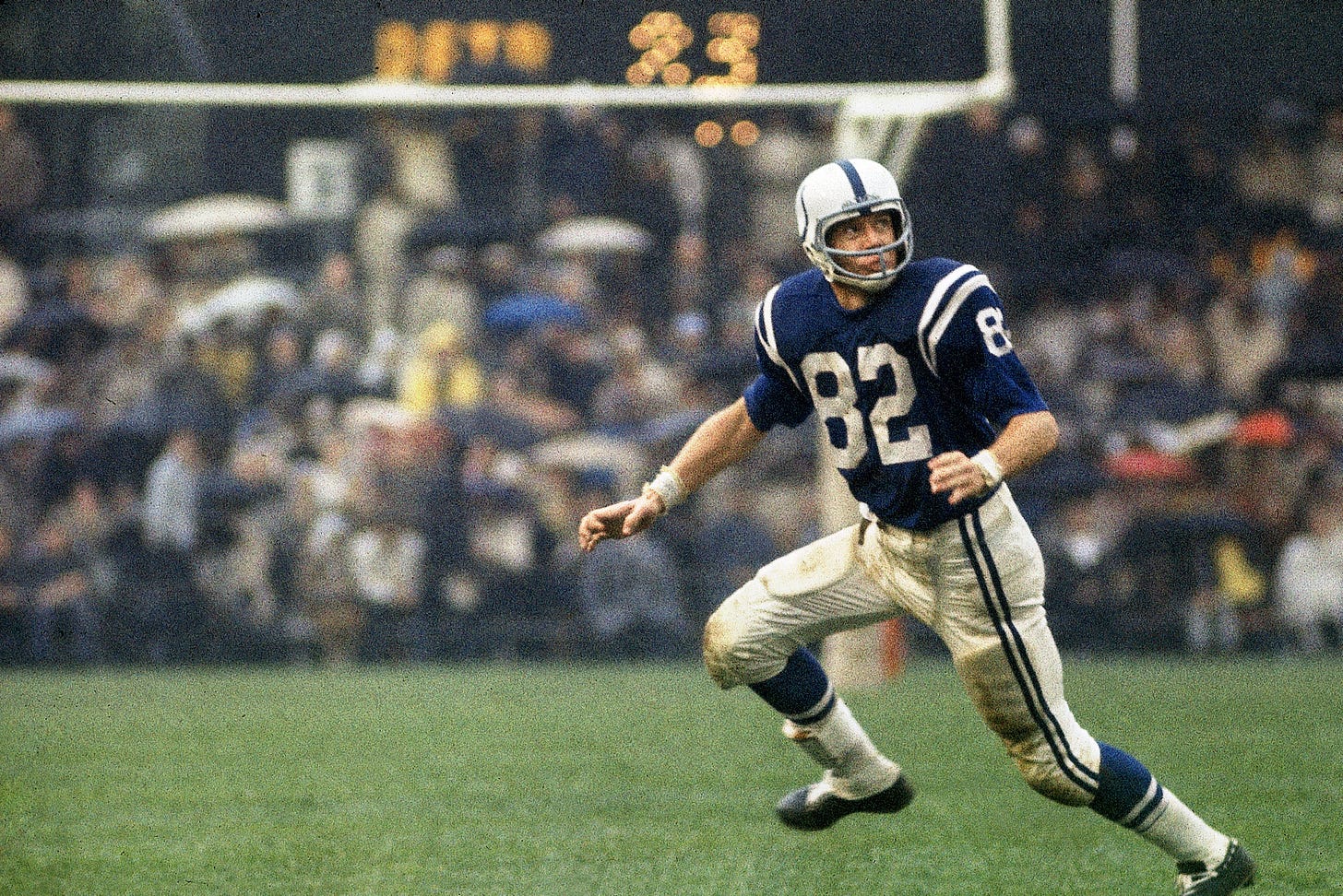 But even those gaudy numbers do not fully describe his impact on that game and, in a larger sense, THE game. The Colts trailed by three with two minutes left, and that’s when Unitas and Berry took them on the original two-minute drive. Three times Unitas connected with Berry on long passes, even though the Giants were double-covering him on every play. The Colts kicked the game-tying field goal and forced the NFL’s first sudden-death overtime.