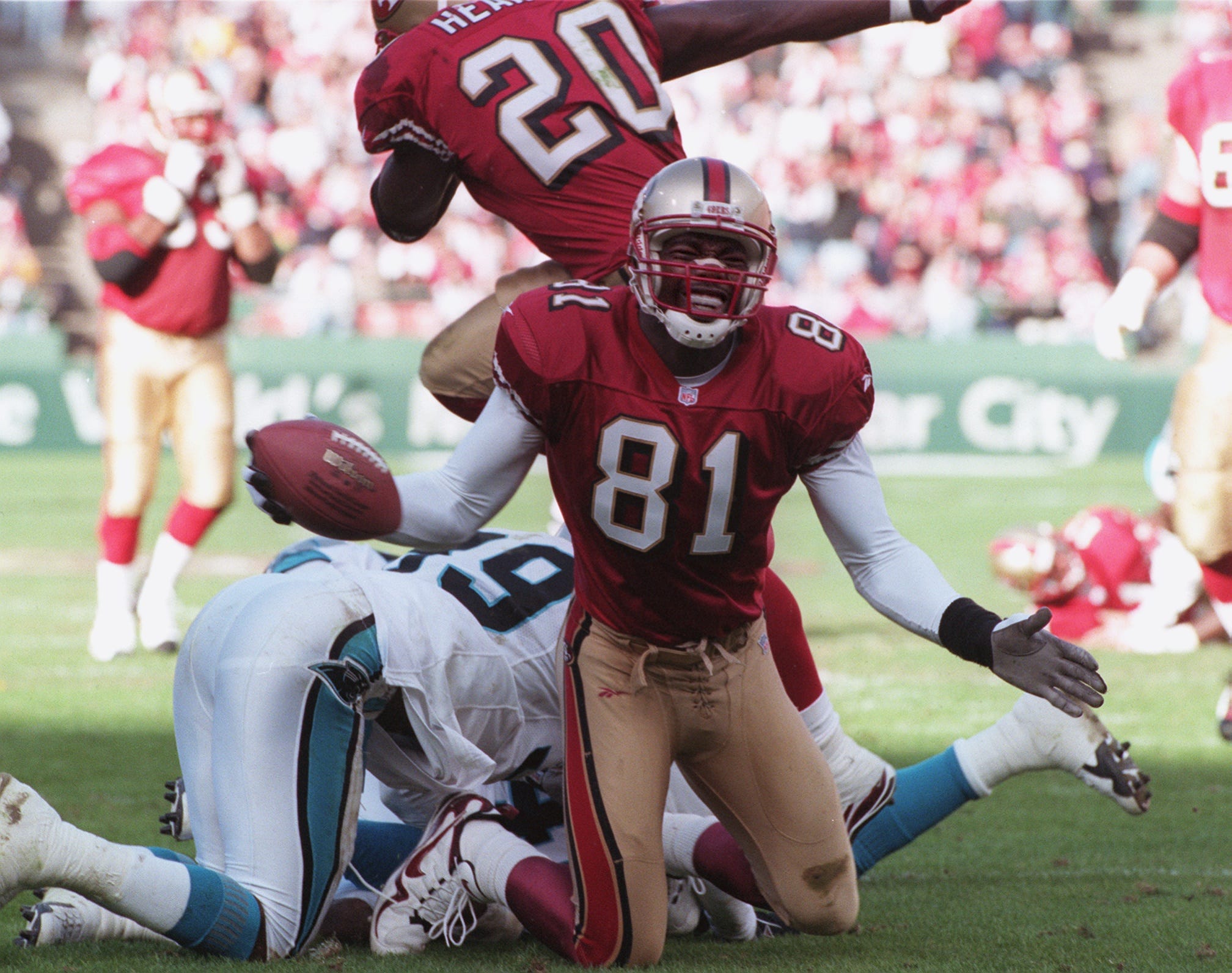 Growing up that way, as Owens himself said, made it difficult for him to relate and engage with other people. In college, he made up for this by going over the top, trying harder than anybody, being more supportive than anybody, caring more than anybody. Then, when he got to the NFL, he tried to continue on that path. He joined a 49ers team with Steve Young at quarterback and Jerry Rice at receiver, and he just wanted to soak in all of the knowledge he could from them. And the 49ers were impressed by how quickly he made some big plays and how humbly he made them.