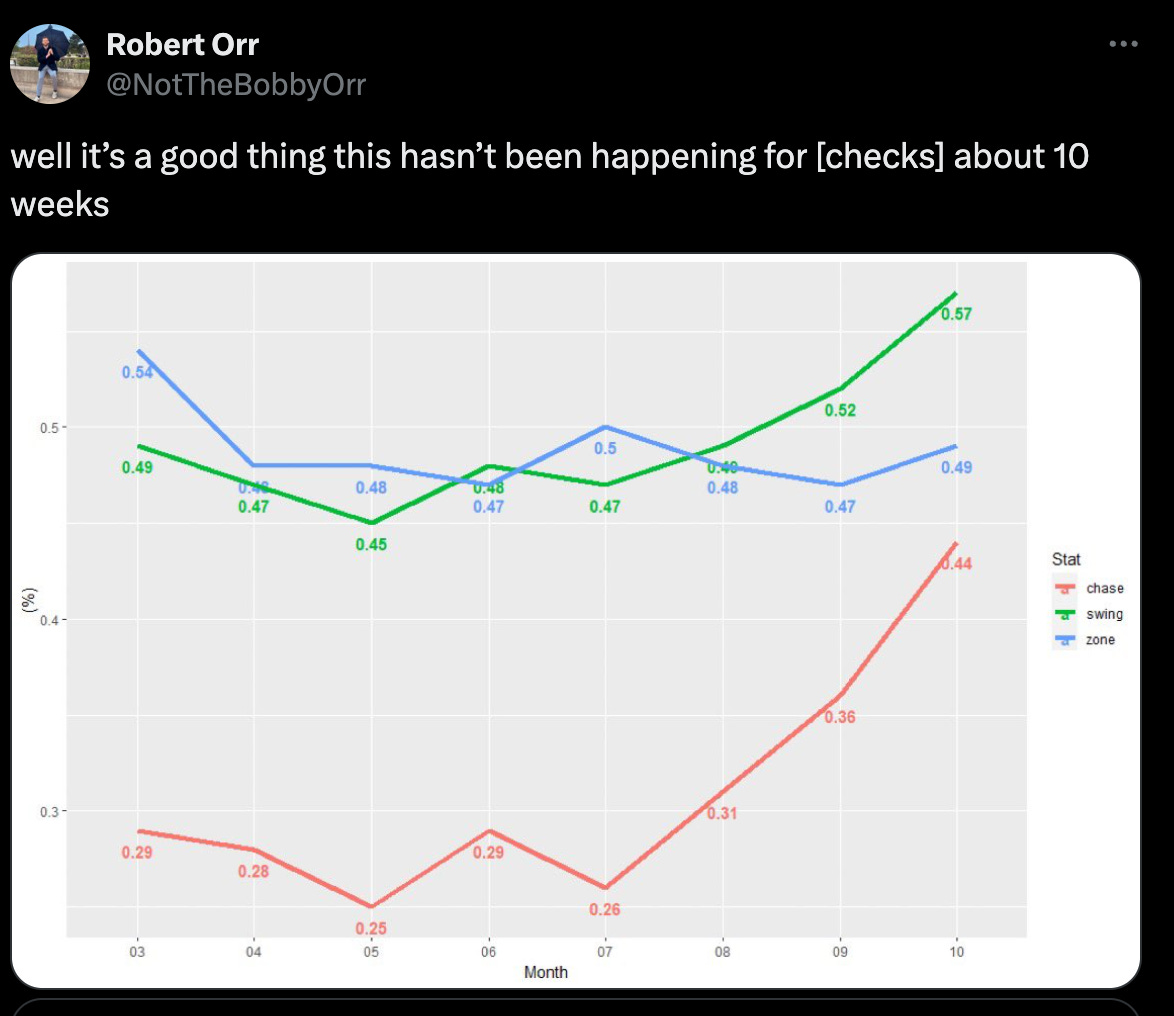 Because I wouldn’t be me if I didn’t look under the hood, consider the Phillies’ chase rate. Robert Orr (@NotTheBobbyOrr on Twixter) posted a graph showing the Phillies’ chase rate on a very tragic ascent—from 26% in July, through 31% and 36% in August and September to a horror-movie 44% in the postseason. (For context, the league-average chase rate is 28.5%.)