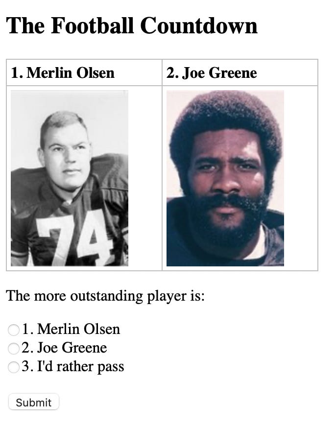 And if you don’t really have an opinion on Merlin Olsen and Joe Greene, you can just click “I’d rather pass” and move on to the next question.
