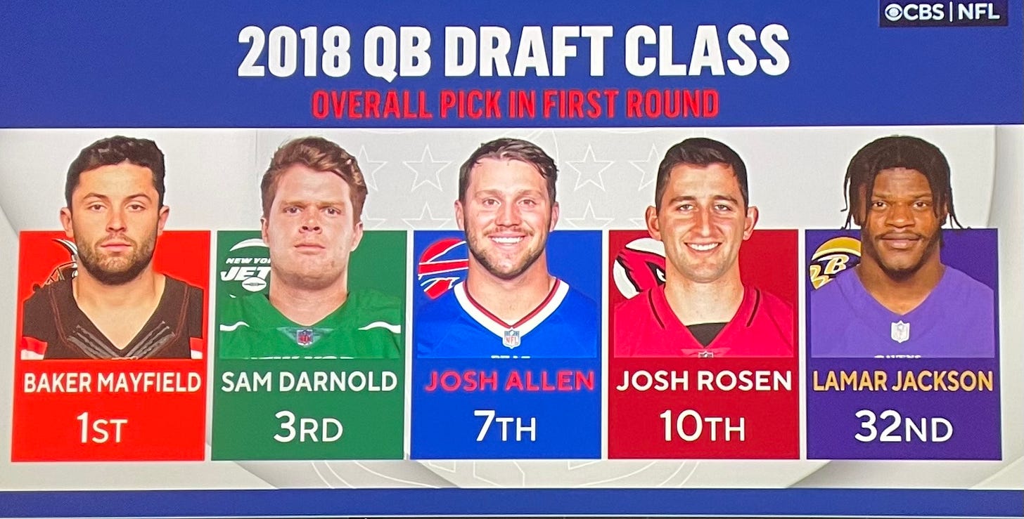 Sure, it is tempting for me to use this as an opportunity to make fun of the Browns and Baker Mayfield — which I will do in a minute — but I need to be straight: I was scared to death that the Browns would take Josh Allen. All I knew about him was that he was a big and reportedly inaccurate lug from Wyoming or maybe North Dakota State*, and that spelled “B-U-S-T” in my mind.