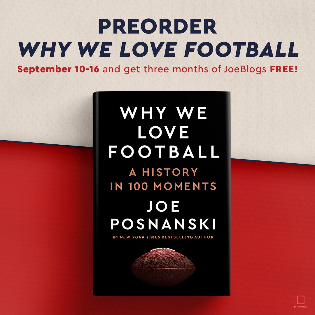 We’re down to the final week before WHY WE LOVE FOOTBALL hits the shelves… and it’s going to be a super-busy week. Well, it’s going to be a super-busy next month or two. But I’m so thrilled. I love the way this countdown of the 100 greatest moments in football history came out, I love the early reaction from reviewers and readers. I just have to share with you a quick call I got from an acquaintance of mine who read an early copy of the book: