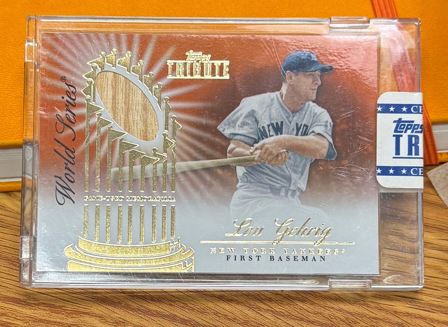 *Brilliant Reader James just sent in an amazing prize; it’s a 2012 Topps Tribute Lou Gehrig World Series Gold Game Used Bat 17/25. I might just buy this card myself by donating $500 to Team Gleason, it’s so awesome. If you want to outbid me, have at it!