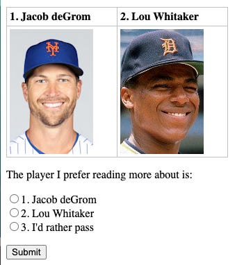 In this particular case, you would be choosing between Jacob deGrom and Lou Whitaker. And when you hit “Submit” you will get two more player, and then two more players, and then two more players for as long as you want to play. And the more you play, the better an answer I will get for who the ten players should be.