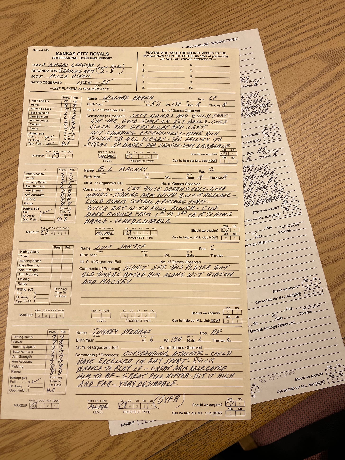 I kept looking at the handwriting — words in all caps, a bit of shake in the writing, as if the author was putting extra pressure on the pen, an architectural feel to it all — and I thought to myself: Holy cow, this is a Buck O’Neil scouting report.
