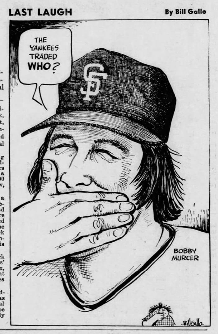 Who got the better of this massive deal? Probably nobody. Bonds put up an excellent 30-30 season for the Yankees in 1975 and made the All-Star team. But the Yankees traded him right after the season, leading to this Bill Gallo cartoon: