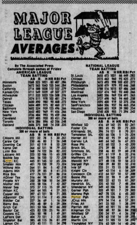 *One thing that is important to note was how INACCURATE these lists were. For instance, Charlie Moore was never 78 for 222 at any point in 1979. After the Aug. 3 game (and this is the Aug. 5 paper, just for an idea of how up-to-the-minute newspapers were back then) he was 78 for 224 and was hitting .348. The numbers never QUITE added up, which is why Bill James took to cutting out boxscores from The Sporting News and doing his own math.