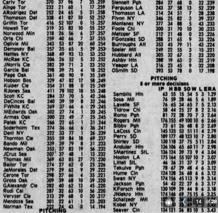 It's fair to say that Brett LOVED this concept of the Mendoza Line. Nobody had to explain it. Young people may find this concept to be entirely foreign and absurd, but back in the 1970s -- long before Baseball Reference or anything resembling it -- baseball fans (and players) used to wait impatiently for the Sunday paper, where you could read a list of the batting averages of players across the league. It looked like this: