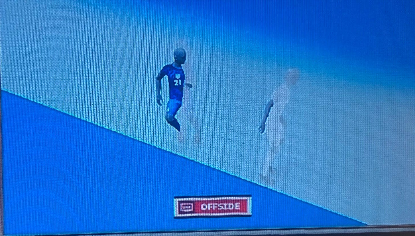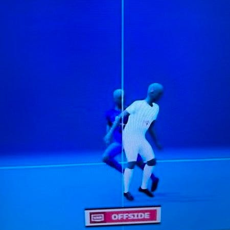I STILL don’t see it. People have explained to me that the rule now is that the offside line is drawn at the shoulder. Maybe that explains it. Maybe it doesn’t. I do not know enough about soccer to complain, but I will anyway: This is very stupid.