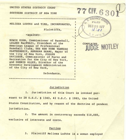 On December 29th, Time Inc., the owner of Sports Illustrated, filed its complaint of gender discrimination with the Southern District Court in Lower Manhattan. The court took the case, and assigned Judge Motley to it. The case became known as Ludtke v. Kuhn.