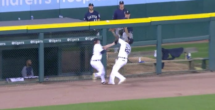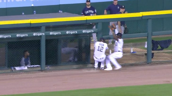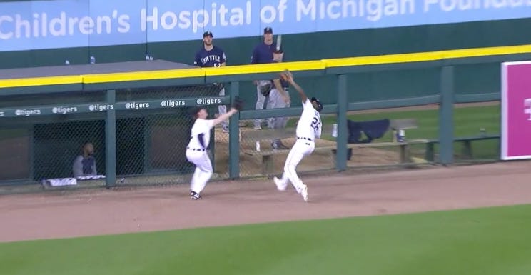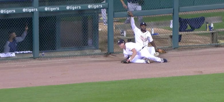 Pop-up, right? It’s 98.4 exit velocity, 32 degree launch angle, ball carried 363 feet the other way. Well let’s see what happens! Looks like Tigers centerfielder Niko Goodrum and leftfielder Brandon Dixon are there on the warning track to make the play. It’s Goodrum’s ball!