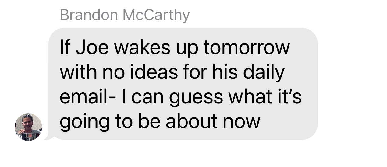 So, there was the briefest moment of “WHAT IN THE WORLD DID I MISS? IS IT BAD?” But, I’ve woken up to loads of texts from these guys in the past—not 81, but a lot—and it’s usually them arguing about a ball-strike call or Brandon going on about LSU something or them discussing Liverpool in a super-specific way. This text thread involved super-expensive sports-card memorabilia auctions or something; I couldn’t get through all 81.
