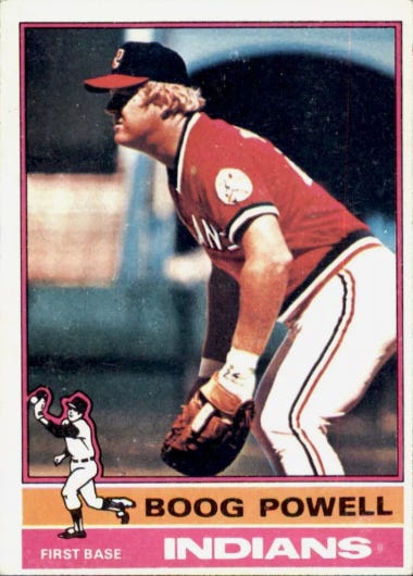 Every morning, first thing, I look at my 1976 Boog Powell baseball card. I love this card so, so much. There’s nothing particularly special about the card itself… I mean, sure, I love Boog Powell as much as the next guy, but he wasn’t a childhood hero or anything like that. He played only two seasons for Cleveland when I was 8 and 9, and even then I understood that he was closer to the end of his career than the beginning.
