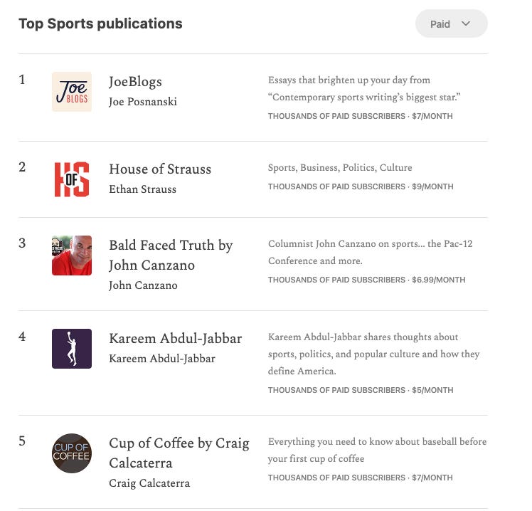 So, now that that is settled … I do have a bit of news. It looks like JoeBlogs is now, for at least one moment here, the No. 1 sports newsletter on Substack. And I have an actual receipt for this one: