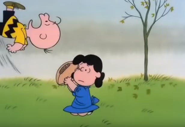 I will try to explain here why the owners and, yes, the players kicked us all in the teeth one more time, and how maybe all is not quite lost (look, Lucy is holding the football again! This time she’s giving her BONDED WORD. Surely, Lucy would not break her BONDED WORD). But before I do that, I want to say something about the players because Wednesday’s fiasco was every bit as much about them as it was the owners.